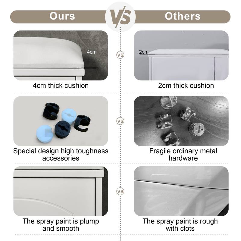 - For added comfort and safety, the bench includes a fireproof sponge and PU cushion. Plus, its unique design boasts a patented appearance, featuring a stylish door texture and easy-to-assemble hinges. Elevate your home with this functional and chic storage solution!