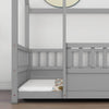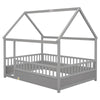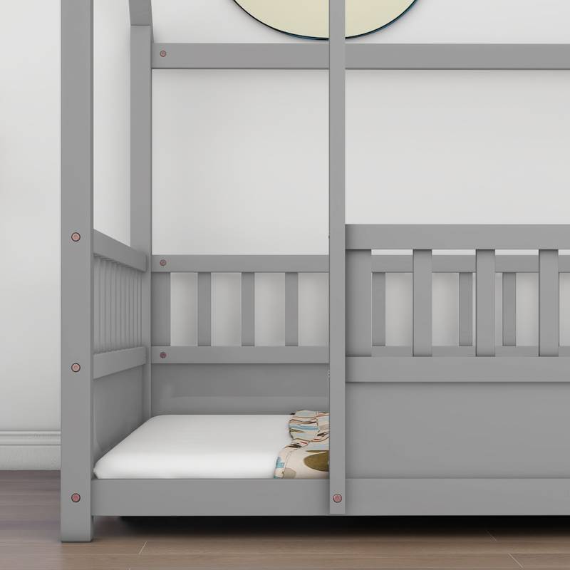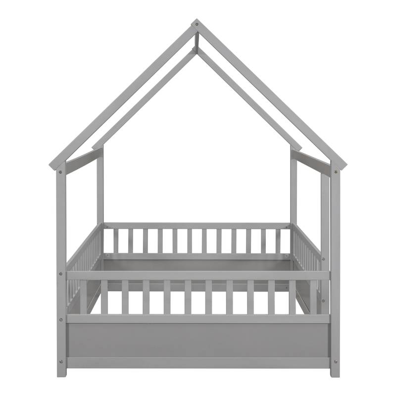 - Introducing our House Frame Floor Bed, a delightful blend of style and safety for your child's bedroom. Crafted from premium pine wood, this bed features a charming roof design that sparks imagination and provides a cozy nook for reading and play.