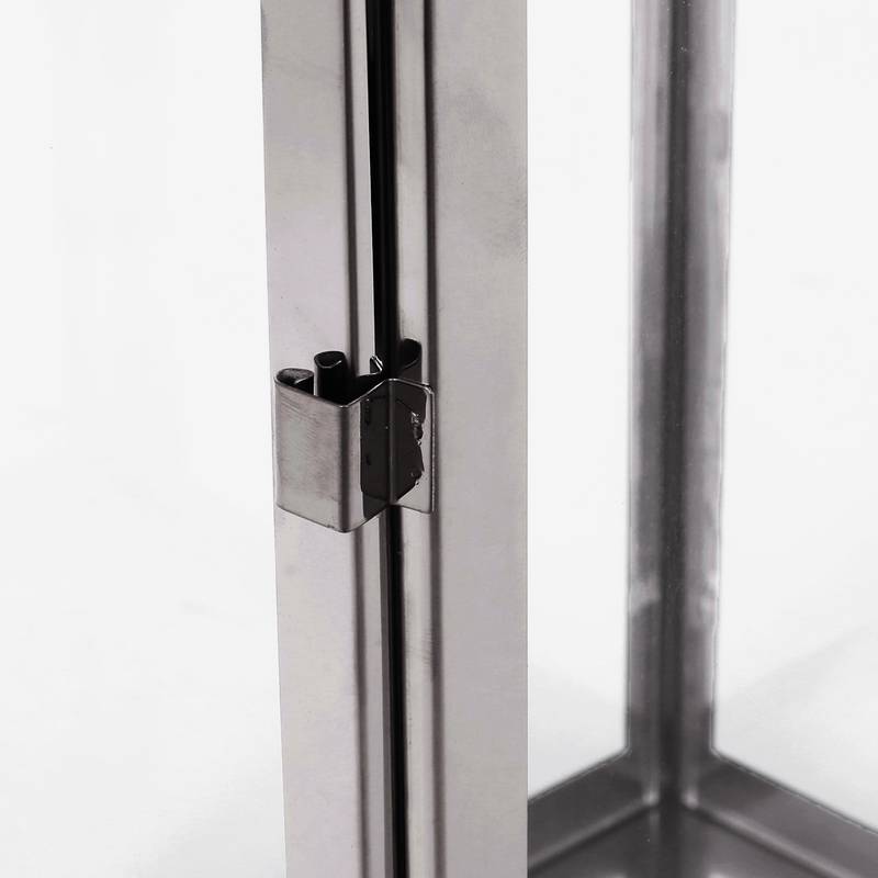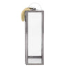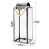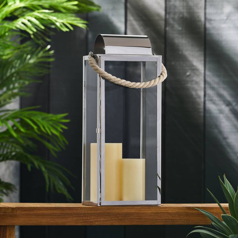- Elevate your outdoor space with our modern stainless steel lantern. Designed with a sleek, polished finish, this 22-inch accessory is both stylish and durable, making it a perfect addition to your patio or backyard. The lantern features a flat-top design with a curved cap and a convenient rope handle for easy portability. Tempered glass panels enhance its beauty while offering superior strength and safety. Measuring 8.50" wide by 6.10" deep, this charming lantern effortlessly transforms any area into a welcoming retreat. Light up your evenings with a touch of elegance!