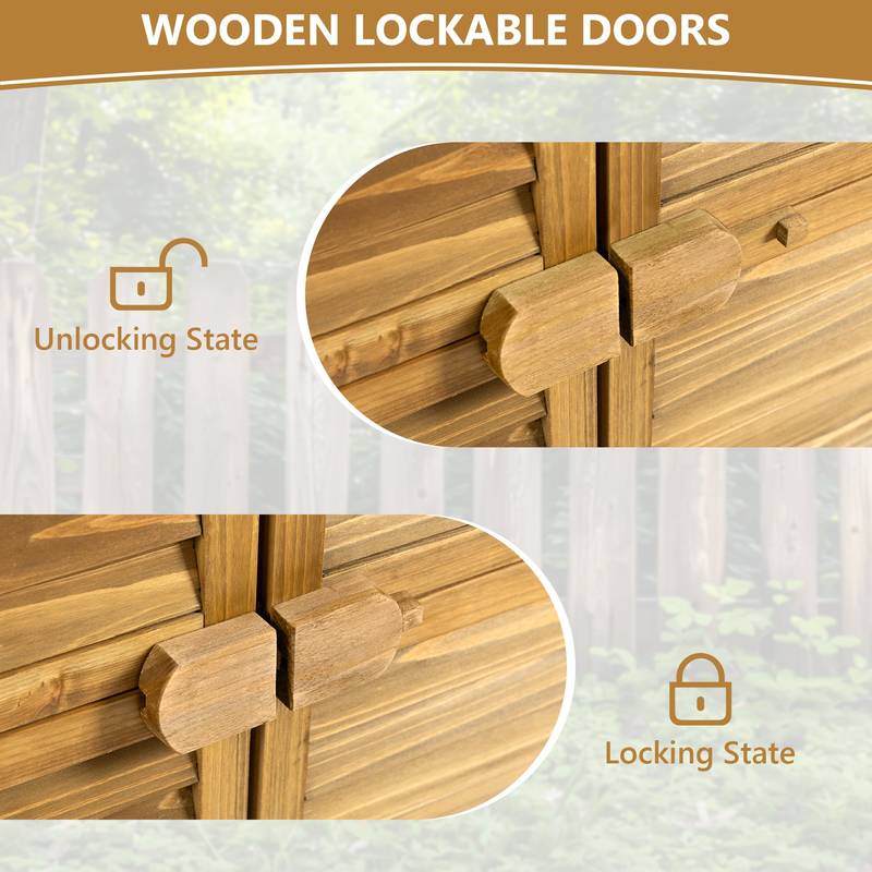 - Introducing our natural wood outdoor storage cabinet, designed to keep your gardening tools organized and protected.