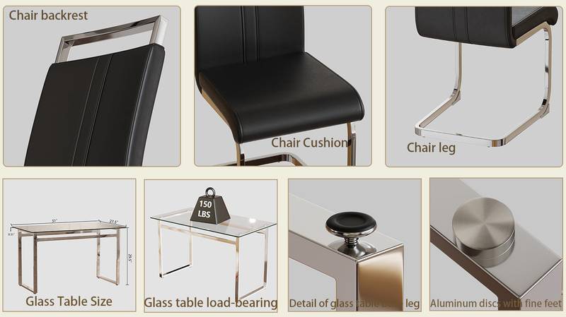 - Introducing our stylish 5-piece dining table set, featuring a sleek tempered glass tabletop and four elegant PU upholstered chairs. The chrome-plated metal legs not only provide excellent stability but also add a modern touch to your dining space. This set is designed with comfort in mind, featuring ergonomic backrests and generous seating for a relaxing dining experience.