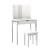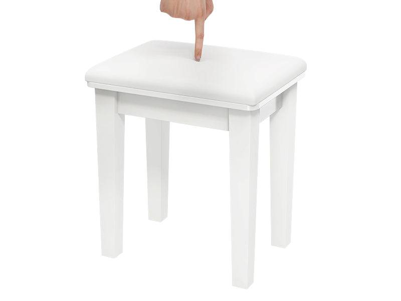 - Featuring a spacious drawer with a handy divider, it keeps your cosmetics, jewelry, and accessories neatly organized. The comfortable PU leather stool supports up to 300 pounds, ensuring a cozy seating solution for your beauty routine.