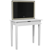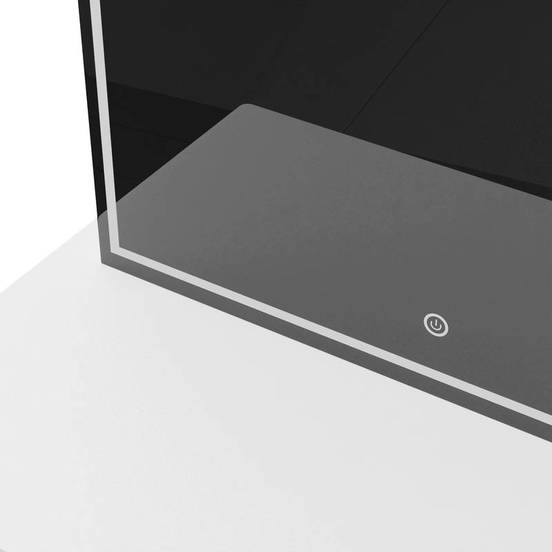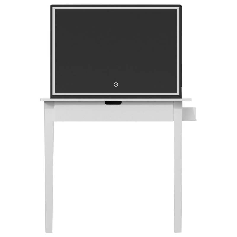 - Transform your space with this sleek white vanity desk, crafted from MDF and glass for a modern look. With its elegant design and versatile LED lights that adjust to warm yellow, white, or cool white, this piece enhances any bedroom or dressing area.
