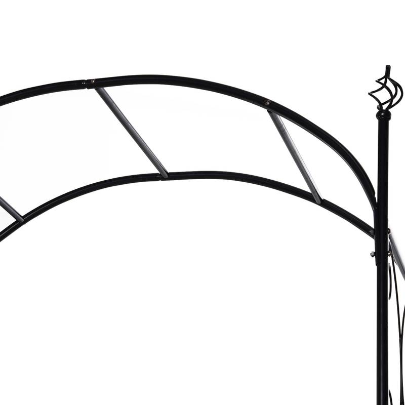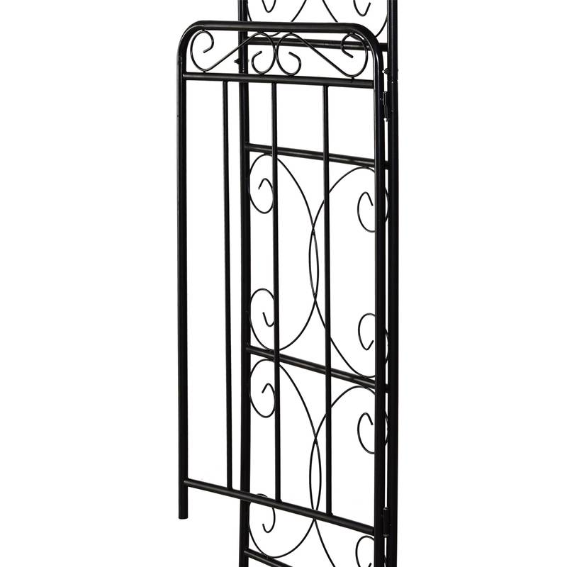 - Enhance your garden or wedding venue with our stylish black metal garden arbor. Standing at 42.5 inches wide and 84.75 inches tall, it features a beautifully designed two-trellis structure with intricate scrollwork and arrow tip motifs. The lockable double-door gate not only offers security but also creates a charming entrance for special events. Ideal for climbing plants like grape vines, it can also be decorated with flowers, balloons, or lights for a stunning display. Made from durable epoxy-coated steel, this weather-resistant arbor combines functionality and elegance for any indoor or outdoor setting. Elevate your space with this versatile garden accessory!