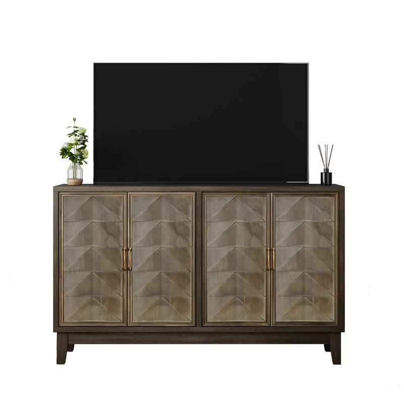 - Introducing our stylish Brown Sideboard Buffet Cabinet, expertly crafted from solid wood and MDF, blending retro charm with modern design. With a generous size of 55.12"L x 15.75"W x 33.86"H, this cabinet features four chic doors and multiple adjustable shelves that provide ample storage for everything from clothes to dining essentials, keeping your space neat and organized.