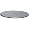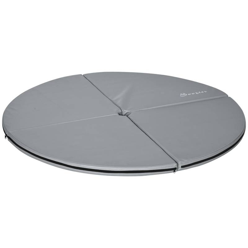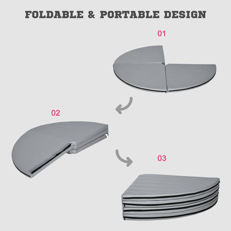 - Measuring 59 inches in diameter and just 2 inches thick, this versatile mat is foldable, easily fitting into a compact size for effortless transport and storage. With a durable, waterproof cover, clean-up is a breeze. Plus, it features a universal hole to accommodate most standard pole bases and can double as a round yoga mat for floor exercises.