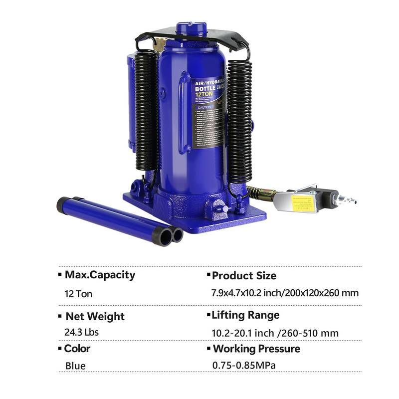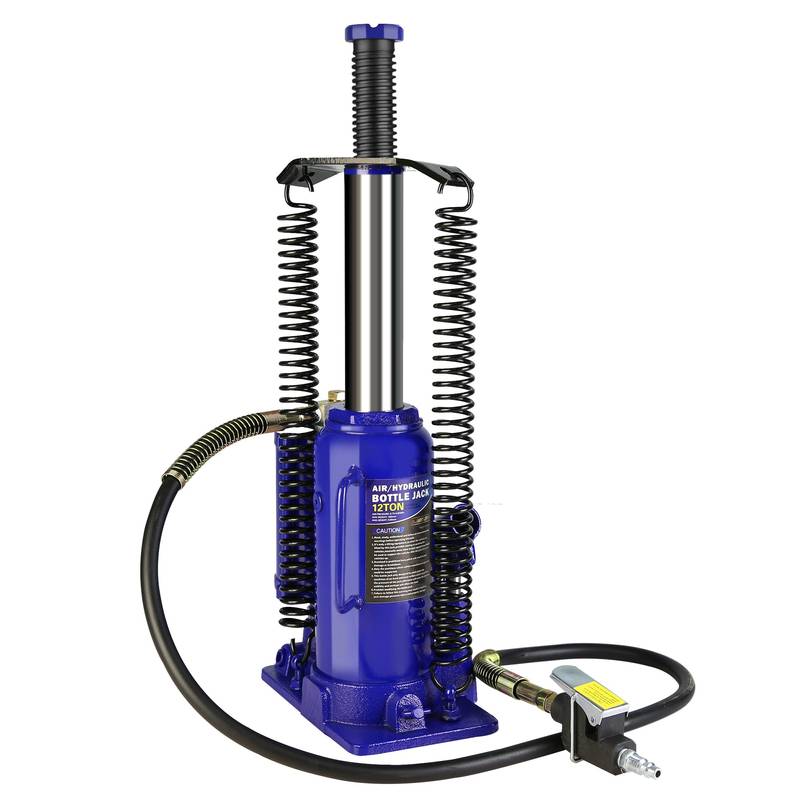 - Get the job done with our powerful 12-ton hydraulic bottle jack, designed for quick and effortless lifting. Just connect it to your air compressor and press the pneumatic switch for swift operation.