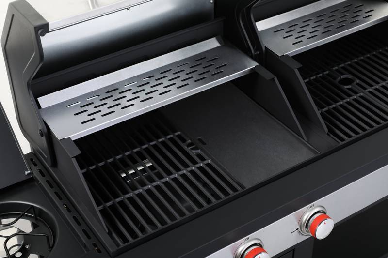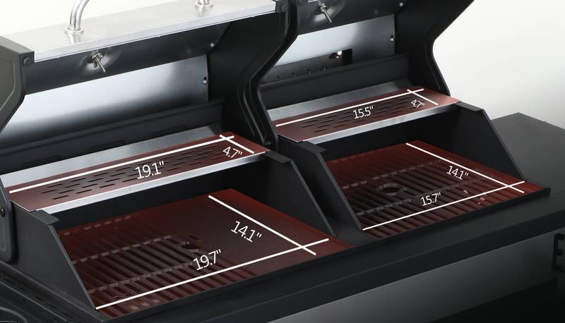 - Key features include a high-temp resistant firebox, easy push-and-turn ignition system, and a precise stainless steel thermometer (100-800F) to ensure perfect cooking every time. Enjoy cooking with enamel cast iron grilling grids, offering ample space for both charcoal and gas. Plus, the integrated warming rack keeps your food hot while you grill.