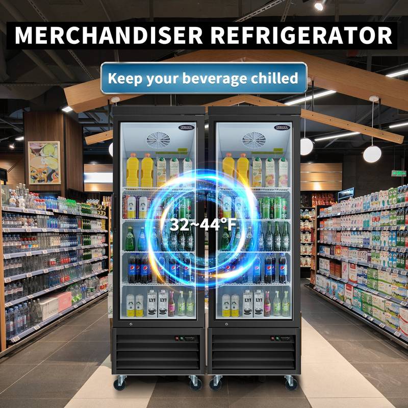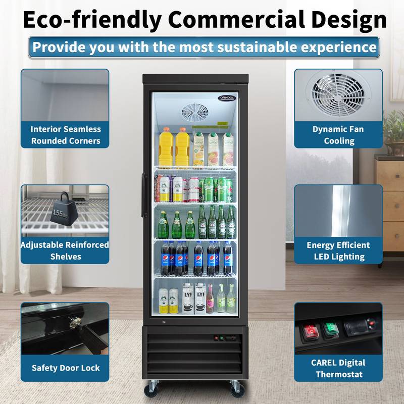 | Features | 0: Double Hollow Tempered Glass for enhanced temperature retention and strength 1: Adjustable epoxy-coated shelves supporting up to 155 lbs each 2: CAREL digital temperature controller with a range of 32~44℉ and automatic defrost 3: Heated Door Frame feature to prevent water buildup 4: Energy efficient LED lighting for optimal visibility 5: Safety Door Lock with two keys for added security 6: Four Universal Casters, two with brakes for easy movement and stability 7: Clear LCD readout for temperature monitoring |