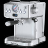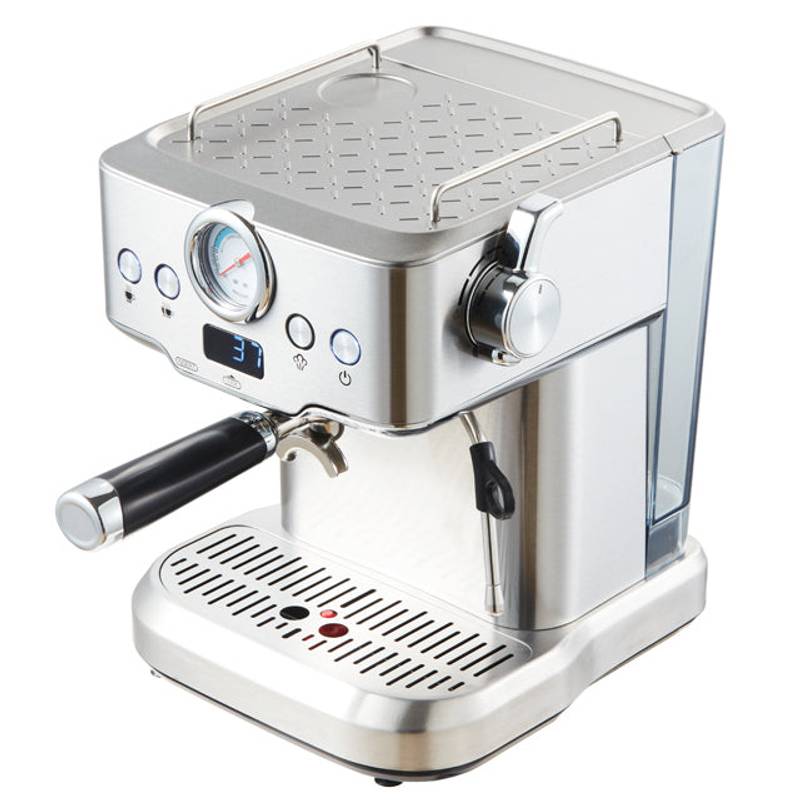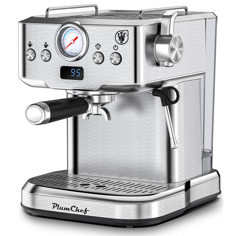 - Experience coffee shop quality at home with our sleek silver espresso machine. Crafted from durable stainless steel, its compact design offers versatile brewing options, producing everything from rich espressos to creamy cappuccinos with 20-bar pressure and precise controls.