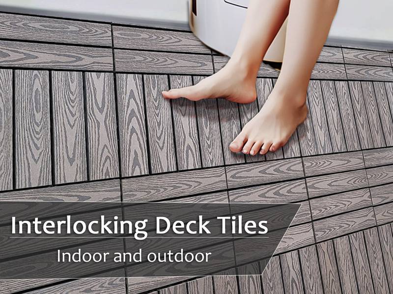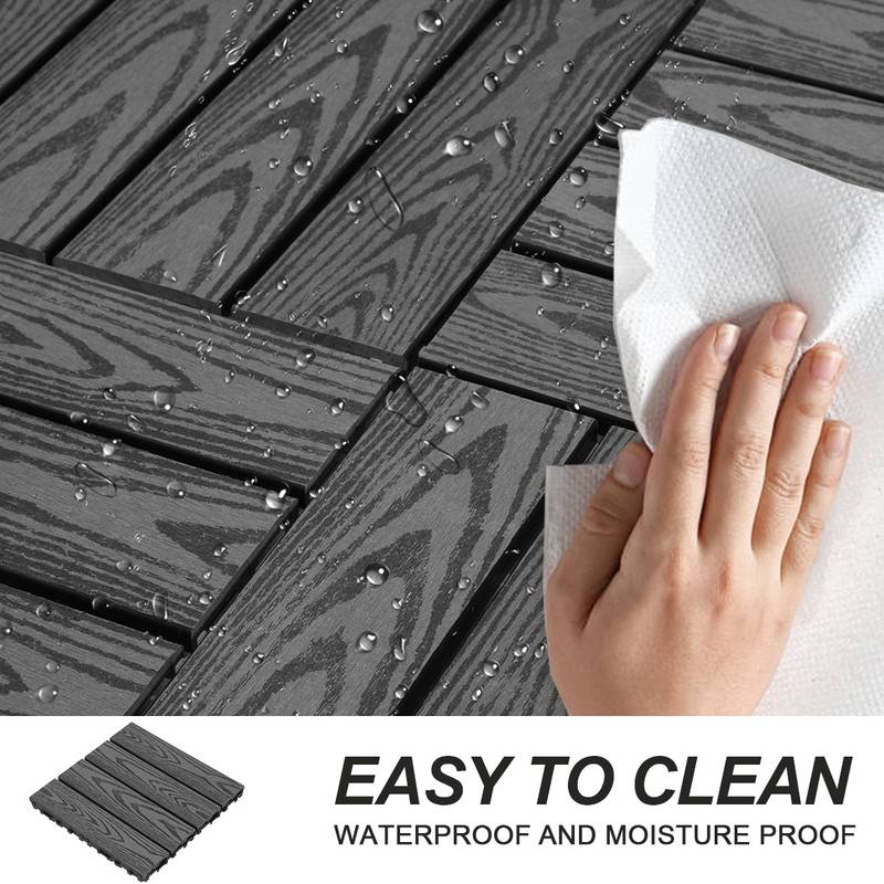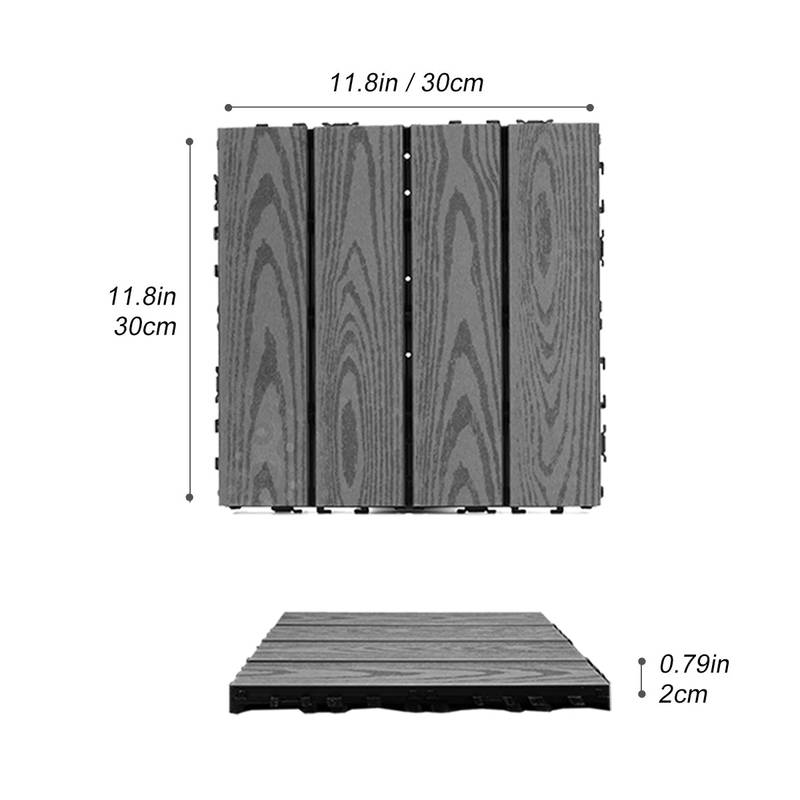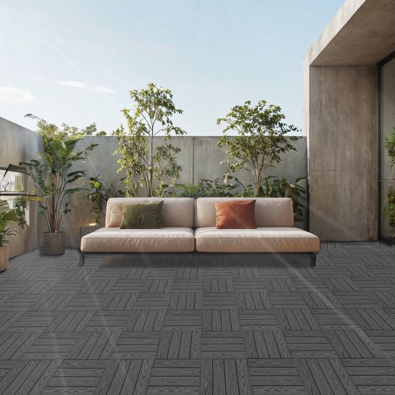 - Transform your outdoor and indoor spaces effortlessly with our stylish dark grey deck flooring tiles. Crafted from premium wood-plastic composites, these tiles combine durability with a modern aesthetic, perfect for patios, balconies, and even indoor rooms.