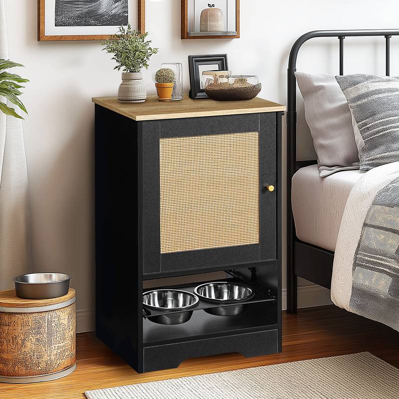 - Introducing the perfect solution for a tidy pet feeding area: our stylish dog feeding station. Crafted from durable black vintage particle board, this feeding station combines functionality with charm.