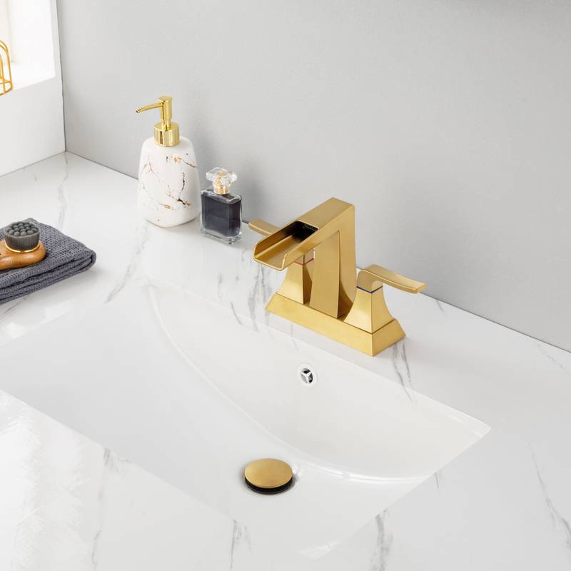 - With a rotatable waterfall spout, enjoy ample clearance for easy handwashing and delicate item cleaning. It comes complete with a matching ABS pop-up drain and necessary water supply lines. Experience precise control over water temperature and flow with the user-friendly two-handle design. Plus, with a flow rate of 1.2 GPM at 60 PSI and rigorous pressure testing, you can trust its performance. Upgrade your bathroom with this stylish and efficient faucet today!