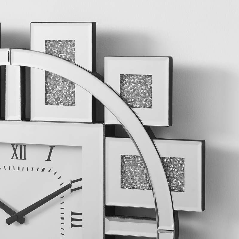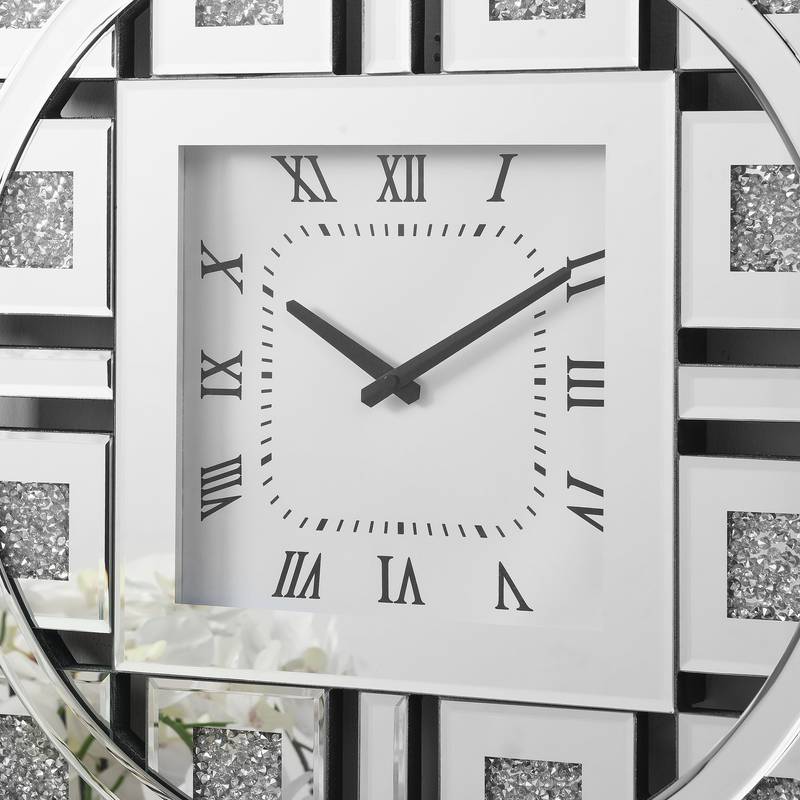 - Elevate your decor with this stunning floating crystal wall clock. Crafted with a sleek square mirror frame and adorned with black floating crystals, it adds a touch of sophistication to any space. Featuring a modern design with Roman numerals, this clock is visually striking yet functional.