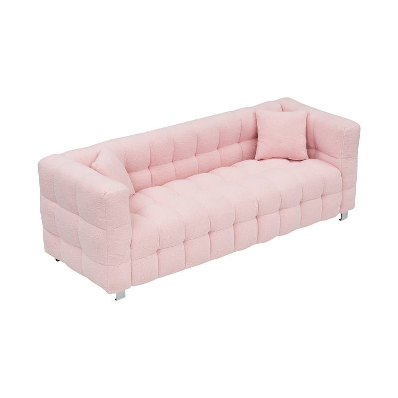 - Introducing the Teddy Fleece Sofa, a stylish and cozy addition to your living space. With a chic pink polyester blend fabric, this 3-seat sofa combines retro charm and modern comfort.