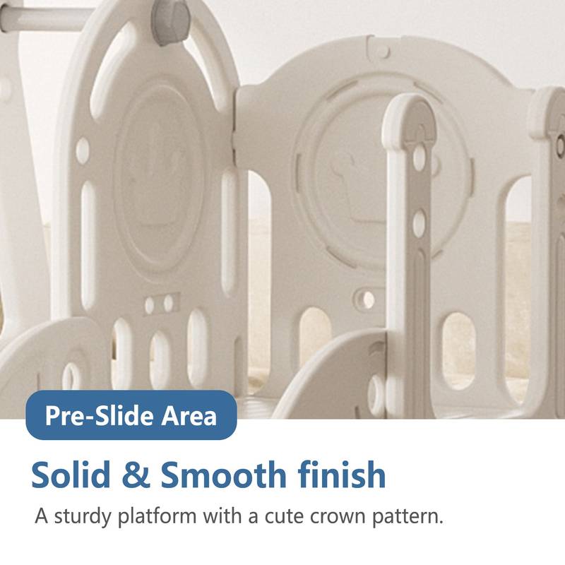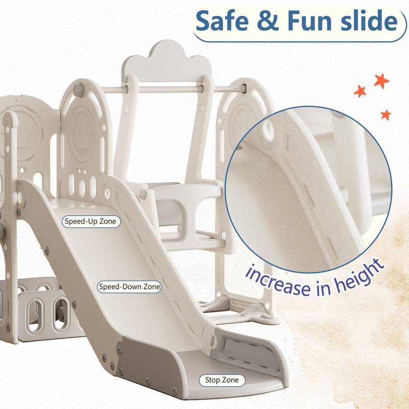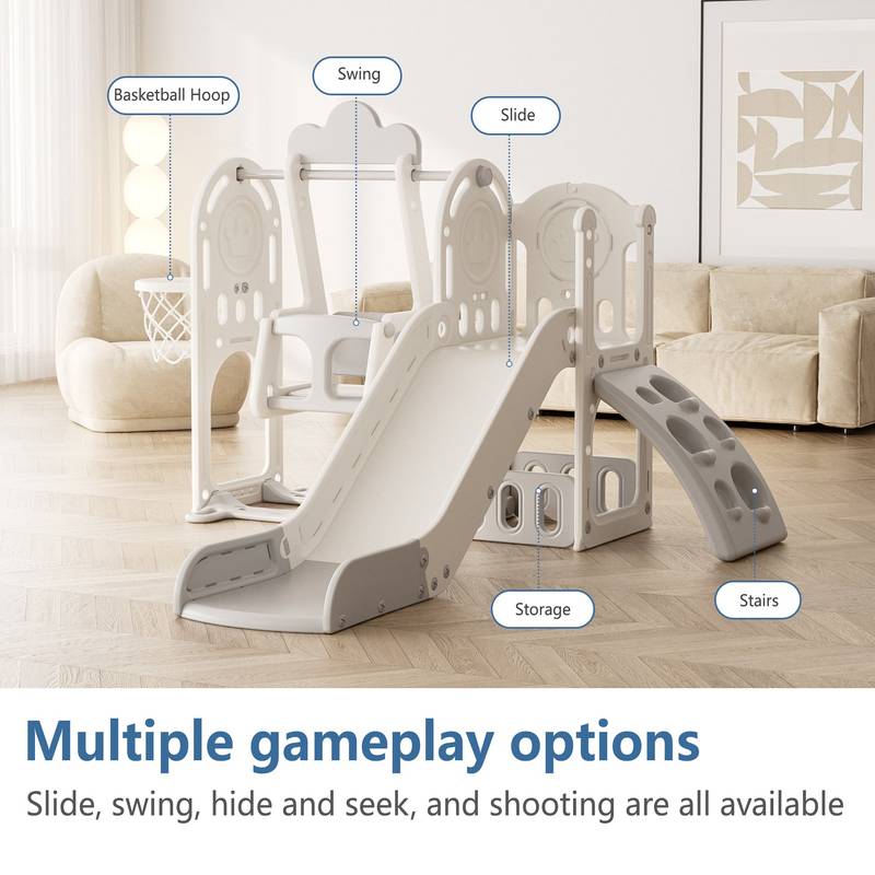 - Introducing our 5-in-1 Activity Center, a versatile playground designed for toddlers aged 1-4. Featuring a grey and ivory color scheme, this sturdy and safe slide offers hours of fun with sliding, climbing, hiding, swinging, and basketball shooting.