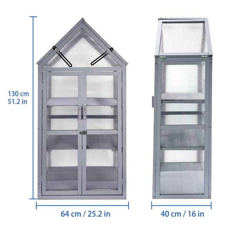 - Introducing our sleek and functional gray wooden greenhouse, perfect for garden and outdoor use. Measuring 25.2 inches in length, 16.1 inches in width, and 51.2 inches in height, it’s both compact and practical, weighing just 17 pounds.