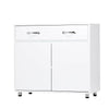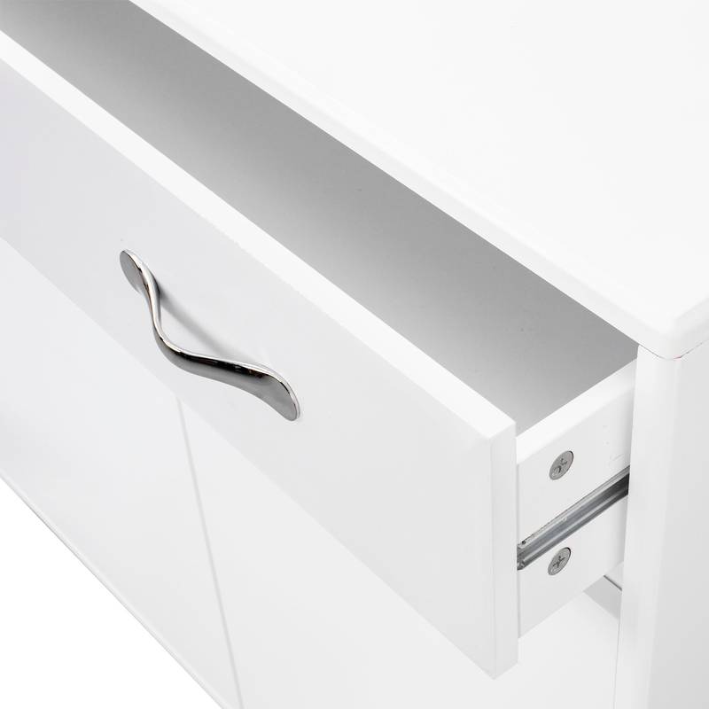 - Introducing our elegant white side table, crafted from high-quality E1 MDF for durability. It boasts a spacious drawer and two shelves, making it a versatile addition to your living room, entryway, kitchen, or bedroom. With a sleek design featuring smooth lines, this table fits seamlessly into any decor style.