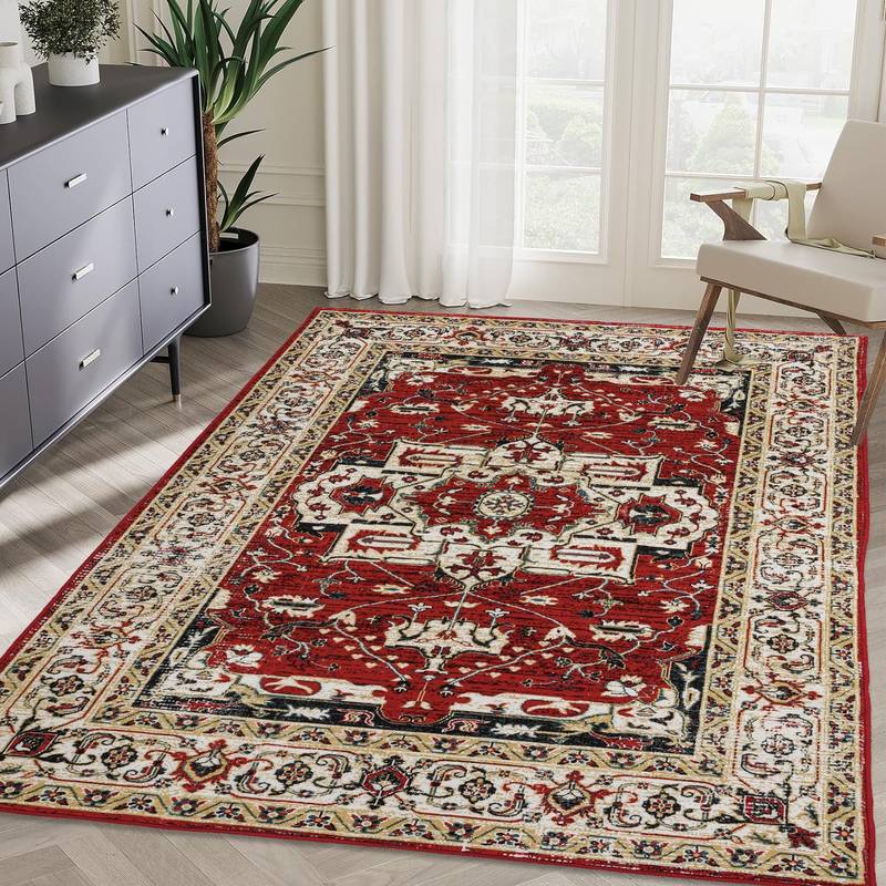 - Introducing our stunning 5x7 area rug, featuring a vibrant yellow and red color palette and a unique floral pattern that adds a touch of vintage charm to any space. Made from high-quality polyester and TPE, this machine-washable rug combines style with practicality, making it perfect for high-traffic areas like living rooms, bedrooms, and kitchens.