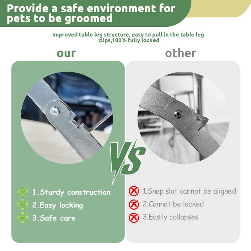 - Key features include a waterproof desktop with an anti-slip coating and rounded corners for protection. An adjustable H-shaped grooming arm with sturdy loops securely holds pets in place, ensuring a stress-free grooming session.
