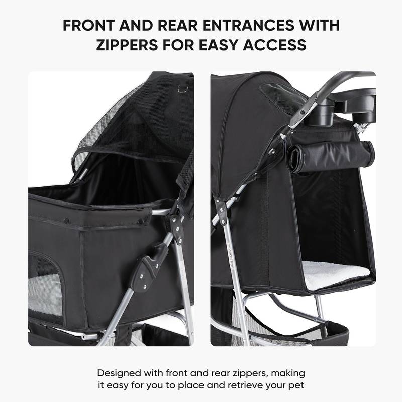 - With plush padding and multiple entry points, your pet will find a cozy retreat wherever you go. Adjustable handlebars and ample storage for your essentials make outings smooth and enjoyable. Built with high-quality materials, this stroller promises durability and functionality, whether you're exploring the city or lounging at the beach.