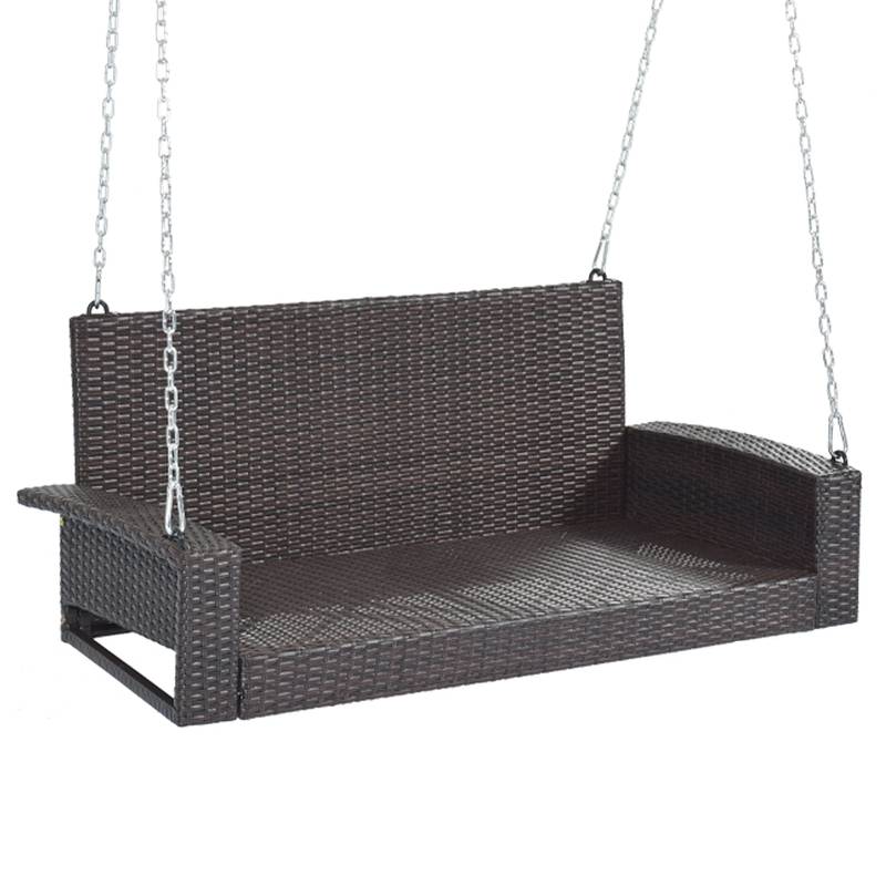 - Experience relaxation like never before with our beautifully crafted wicker porch swing. Designed and made in Vietnam, this stylish brown swing seats up to two people comfortably, with a generous weight capacity of 500 lbs.