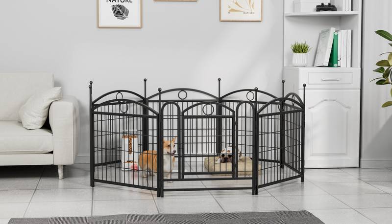- Give your furry friend the freedom they deserve with our spacious Dog Playpen. Originating from China, this black iron playpen measures 48.4” L x 48.4” W x 24.2” H and weighs 20.9 lbs—perfect for indoor or outdoor use.