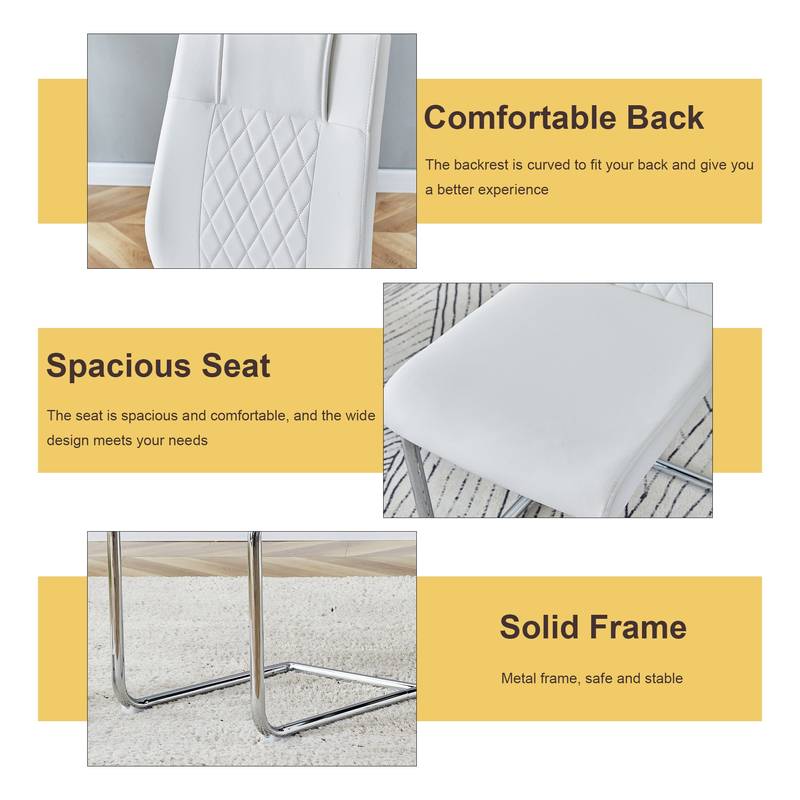 - The dining chairs boast stylish grid-patterned PU cushions, combining comfort with easy maintenance. These cushions, paired with the striking silver legs, enhance the overall elegance of your dining area.