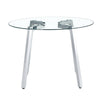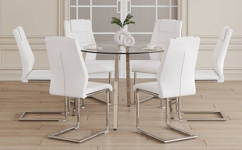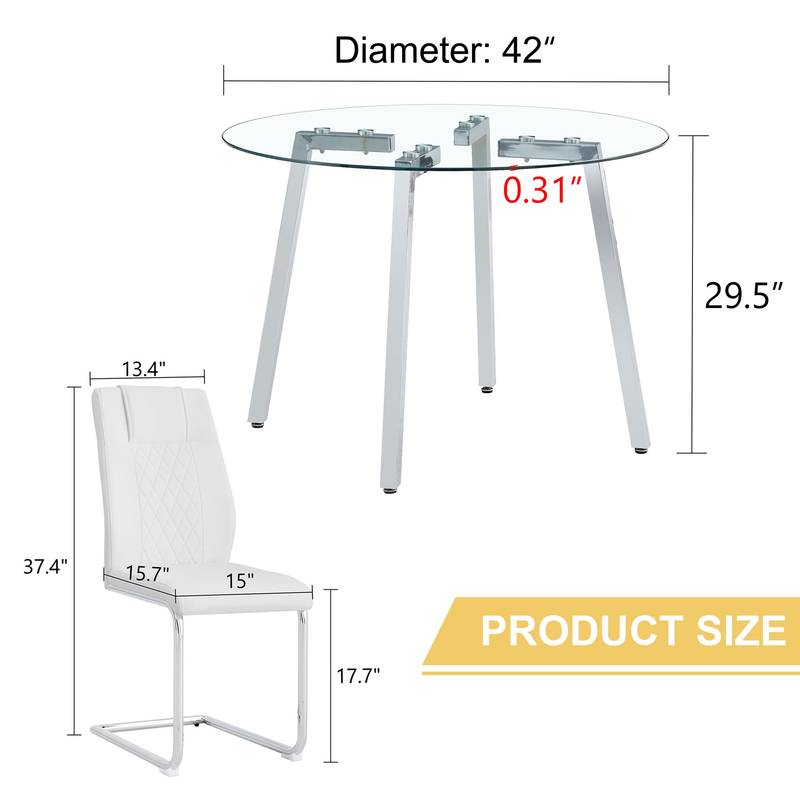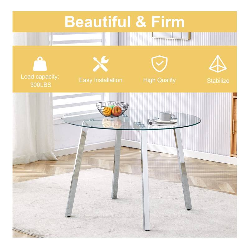 - Elevate your dining experience with our stunning modern dining set. The standout features include a chic circular tempered glass tabletop that offers a sleek, transparent look perfect for any contemporary space. Sturdy silver metal legs provide robust support, ensuring durability for everyday use.