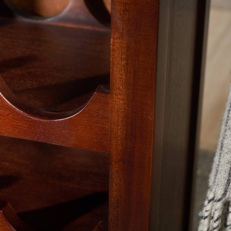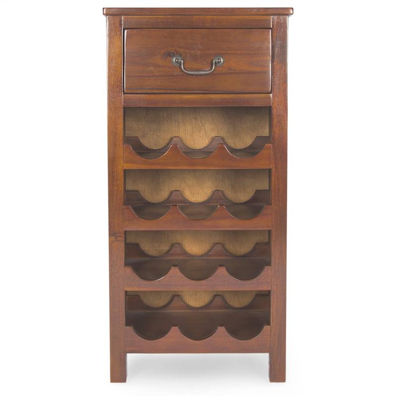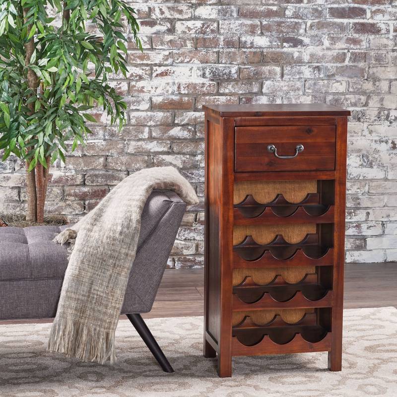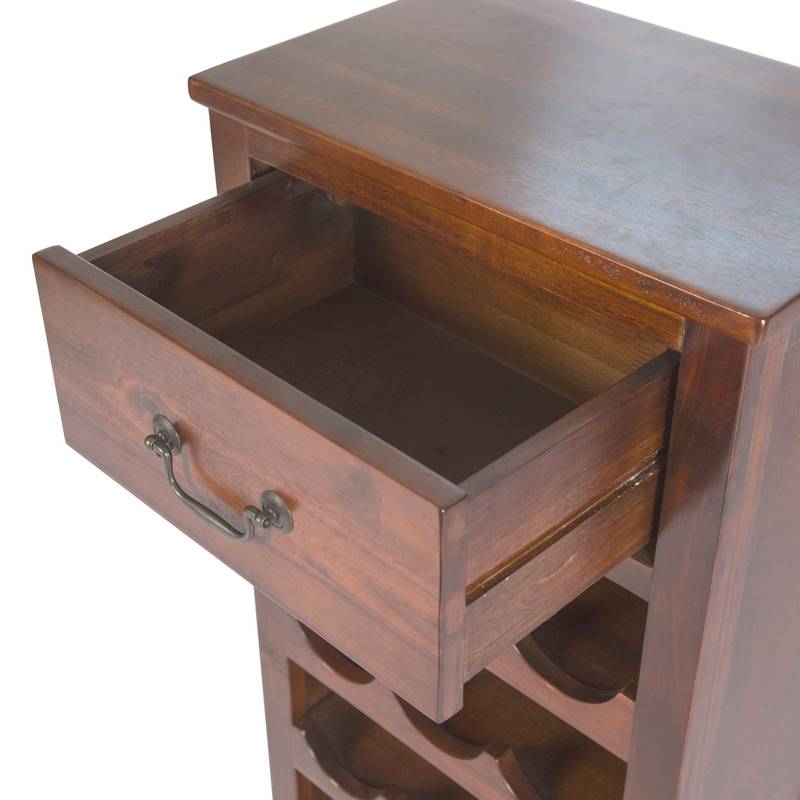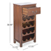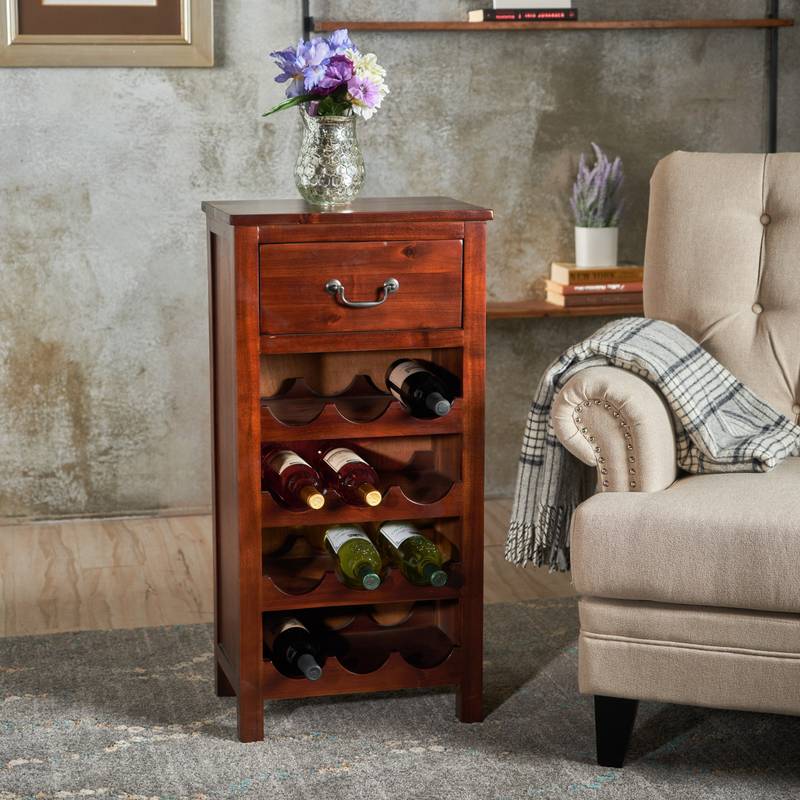 - Introducing the perfect addition to any wine lover's home: a stylish dark brown wine rack made from durable acacia wood. This sleek piece holds up to 12 bottles and features a convenient drawer for your corkscrew and other essentials. With a countertop space for pouring and serving, it's the ultimate all-in-one solution for hosting. Measuring 11.75 inches deep, 17.75 inches wide, and 36 inches high, this elegant rack combines functionality with sophistication, making it an ideal choice for any gathering.