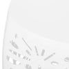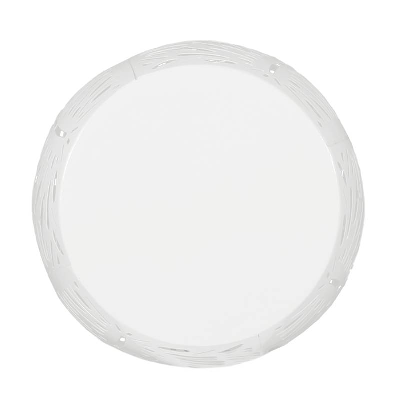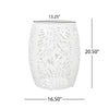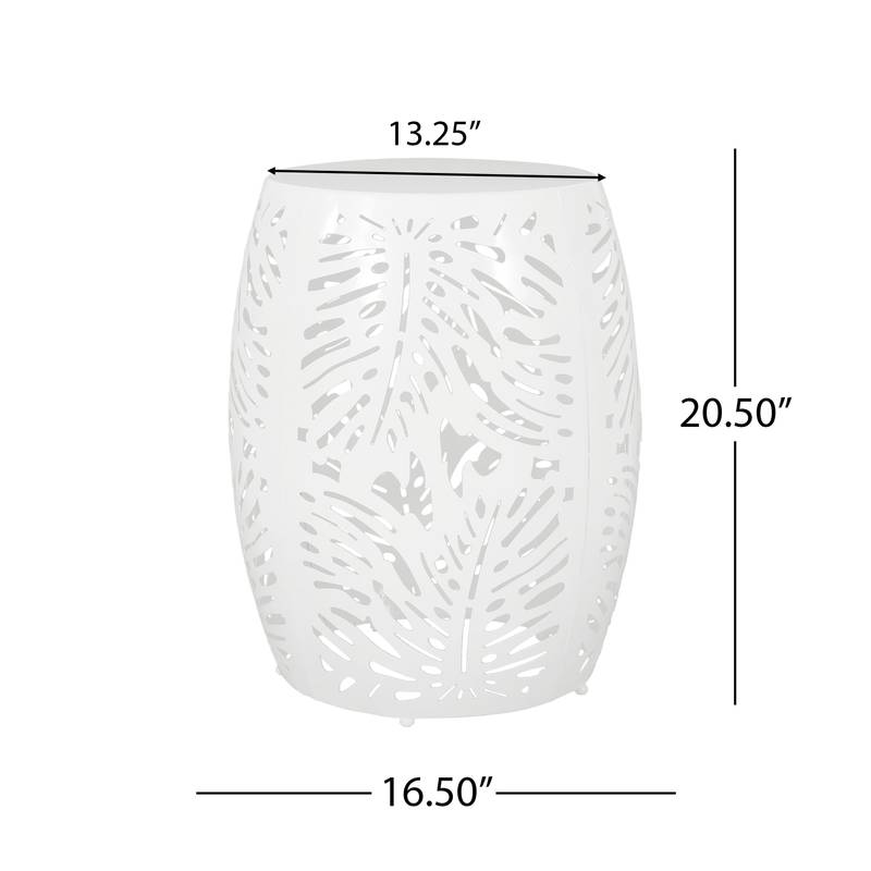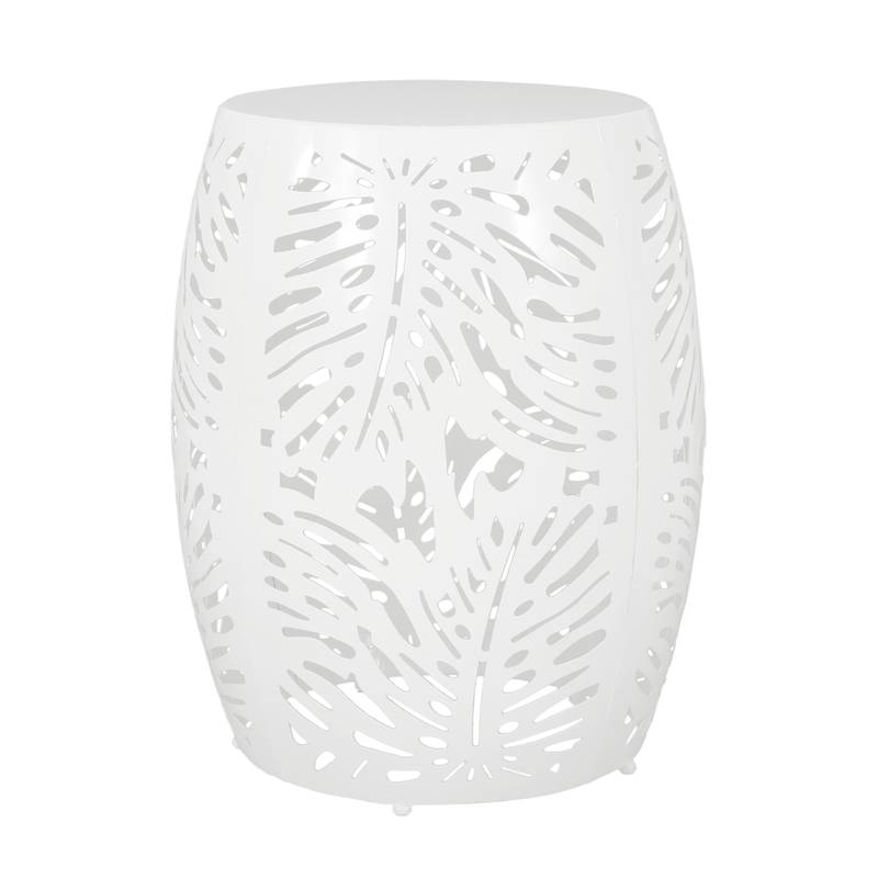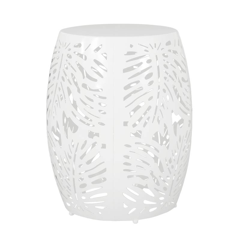 - Introducing our Modern Accent Table, a perfect blend of style and functionality. Featuring a clean, white iron design with a charming barrel structure and elegant tropical palm leaf pattern, this table adds a chic touch to any room.