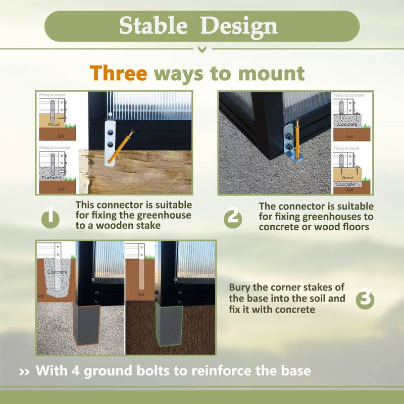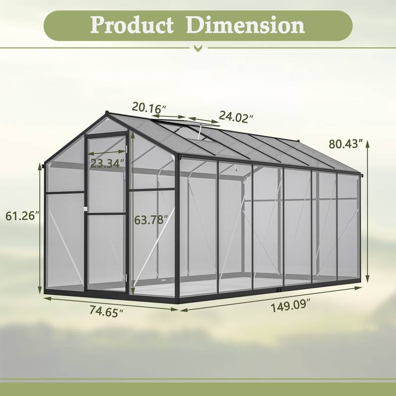 - Enhance your gardening experience with our sleek black aluminum greenhouse, featuring a spacious design (149.09"L x 74.65"W x 80.43"H) that offers ample room for your plants to thrive. Built with durable twin-wall polycarbonate panels, it maximizes light transmission while protecting your plants with UV-coated surfaces.