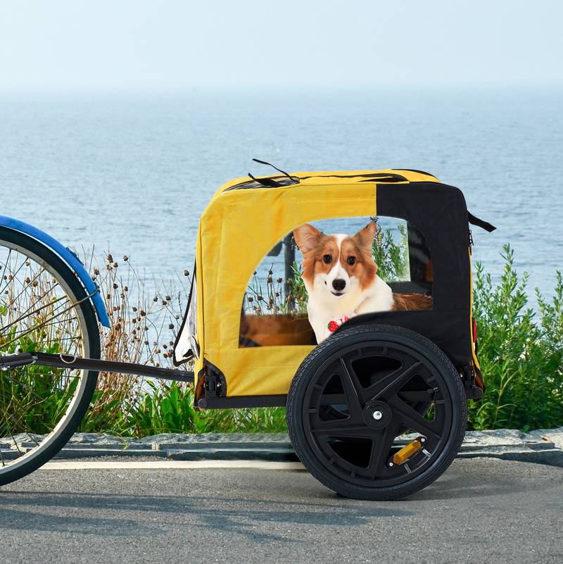 - Introducing our Bike Pet Trailer, designed for both small and large dogs. With a sturdy steel frame in a vibrant yellow, it's both stylish and functional.
