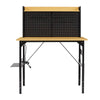 - Introducing our versatile workbench, designed for both functionality and style. With its striking yellow and black colors, this engineered wood and iron workstation doesn’t just look good, it’s built to last.