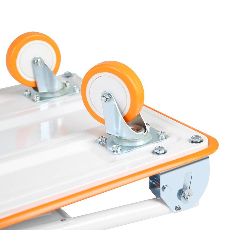 - With a robust steel construction, this orange dolly can handle up to 330 lbs while remaining lightweight at just 15.4 lbs. Its compact dimensions (28.7" L x 19" W x 32.5" H) make it easy to store and transport.