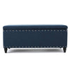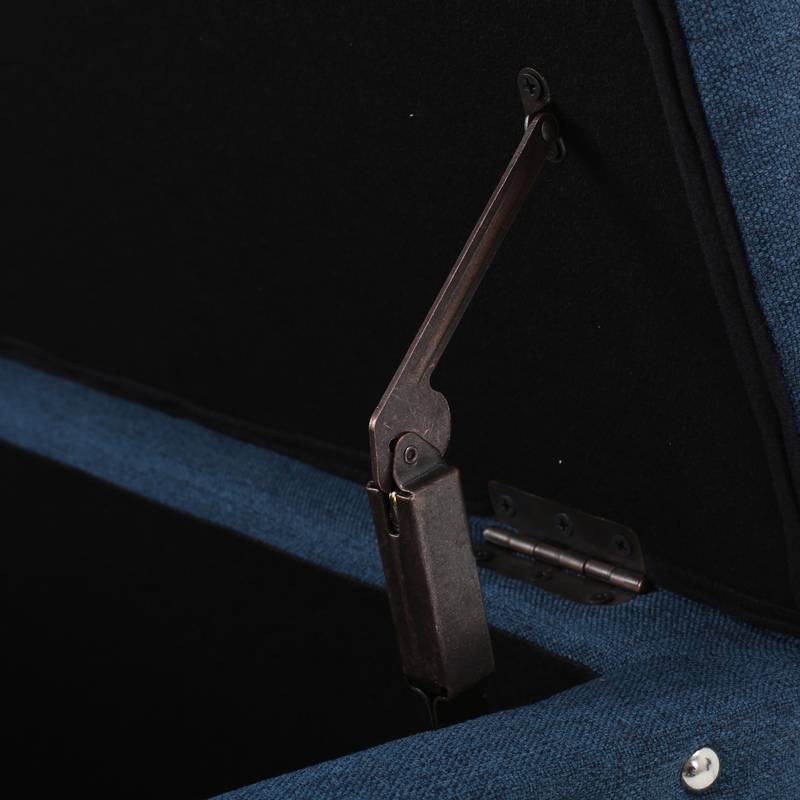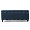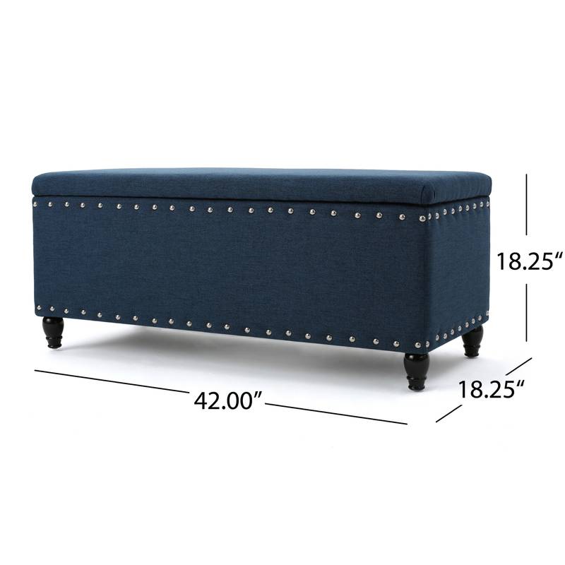 - Introducing our stylish navy blue storage ottoman, a perfect blend of function and elegance. With dimensions of 42 inches wide, 18.25 inches deep, and 18.25 inches high, this ottoman offers ample storage space while enhancing your decor. Crafted from 100% polyester for durability, it features sturdy birch legs finished in dark brown for a chic touch. Light assembly is all it takes to elevate your living space. Enjoy the convenience and style of this versatile piece today!
