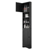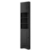 - Introducing our sleek black corner bathroom cabinet, expertly crafted from high-quality, durable MDF. Its stylish triangle design seamlessly fits into any tight space, maximizing storage while maintaining a clean appearance.
