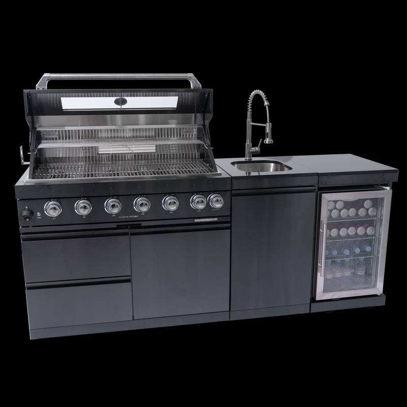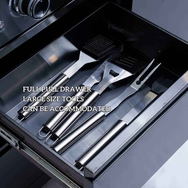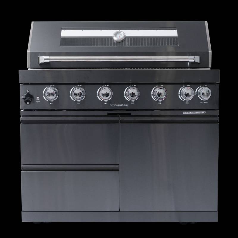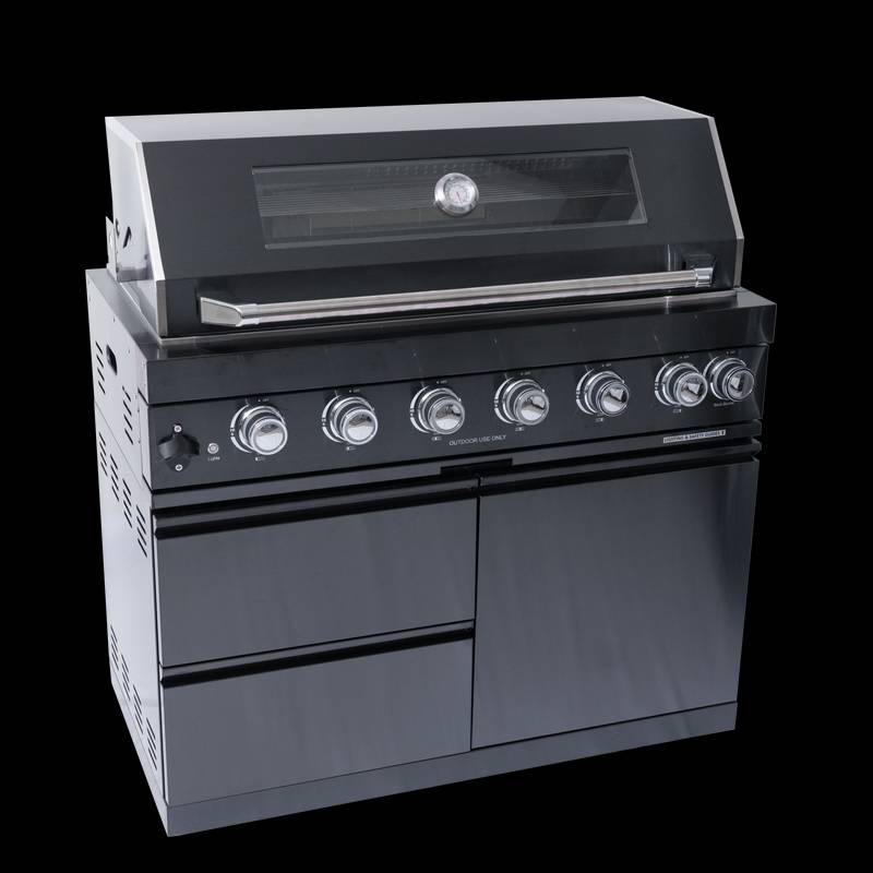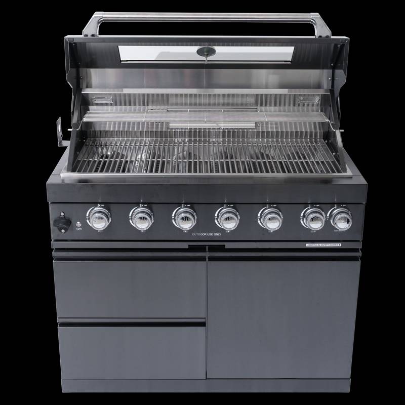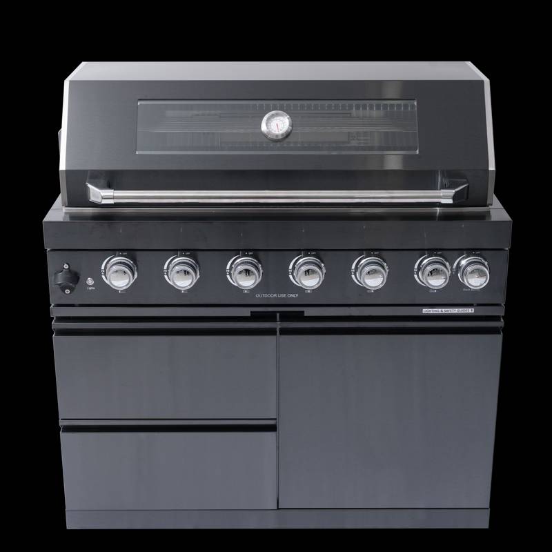 - Additional perks include a double-lined hood with a temperature gauge for optimal heat retention, halogen cooking surface lights, an electronic ignition system, and an easy-access grease tray for simple cleanup. The stylish black granite countertops provide storage with drawers and cabinets, while gliding castor wheels offer easy maneuverability.
