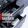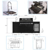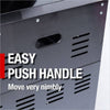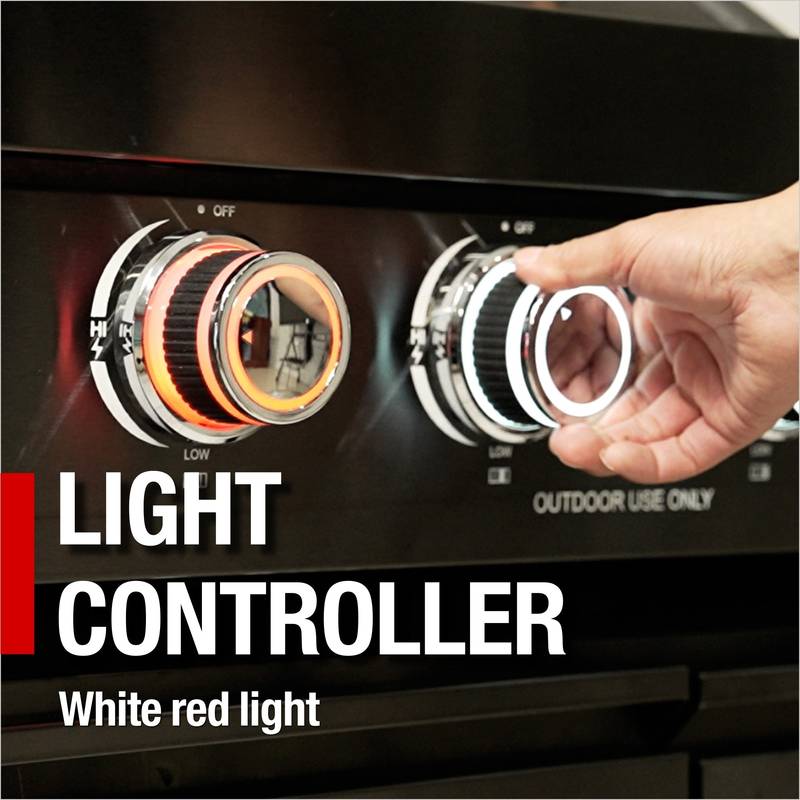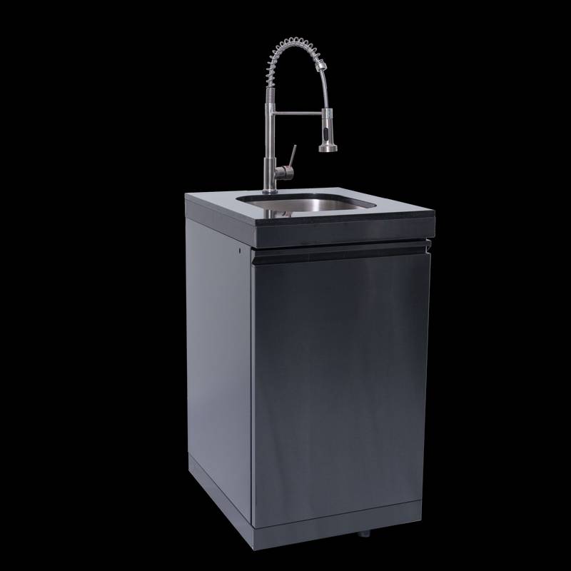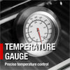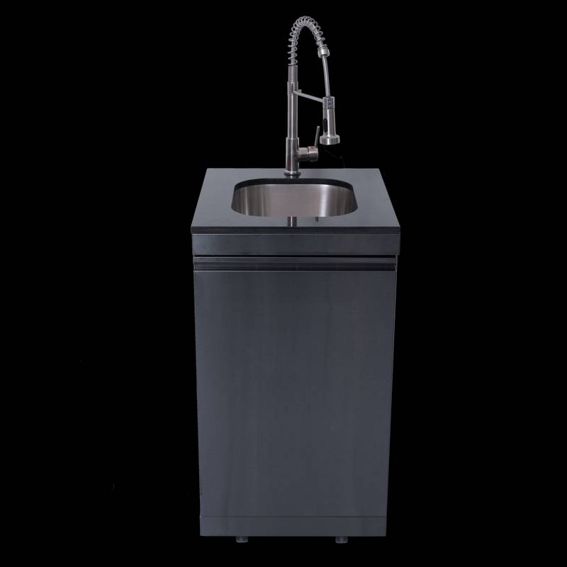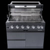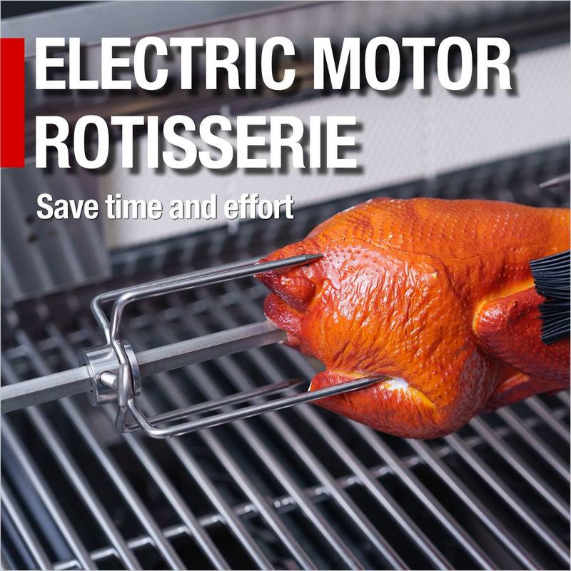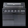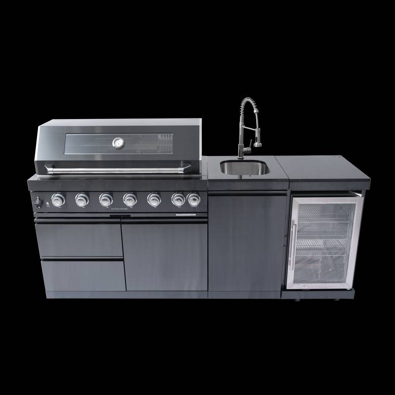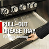 - Additional perks include a double-lined hood with a temperature gauge for optimal heat retention, halogen cooking surface lights, an electronic ignition system, and an easy-access grease tray for simple cleanup. The stylish black granite countertops provide storage with drawers and cabinets, while gliding castor wheels offer easy maneuverability.