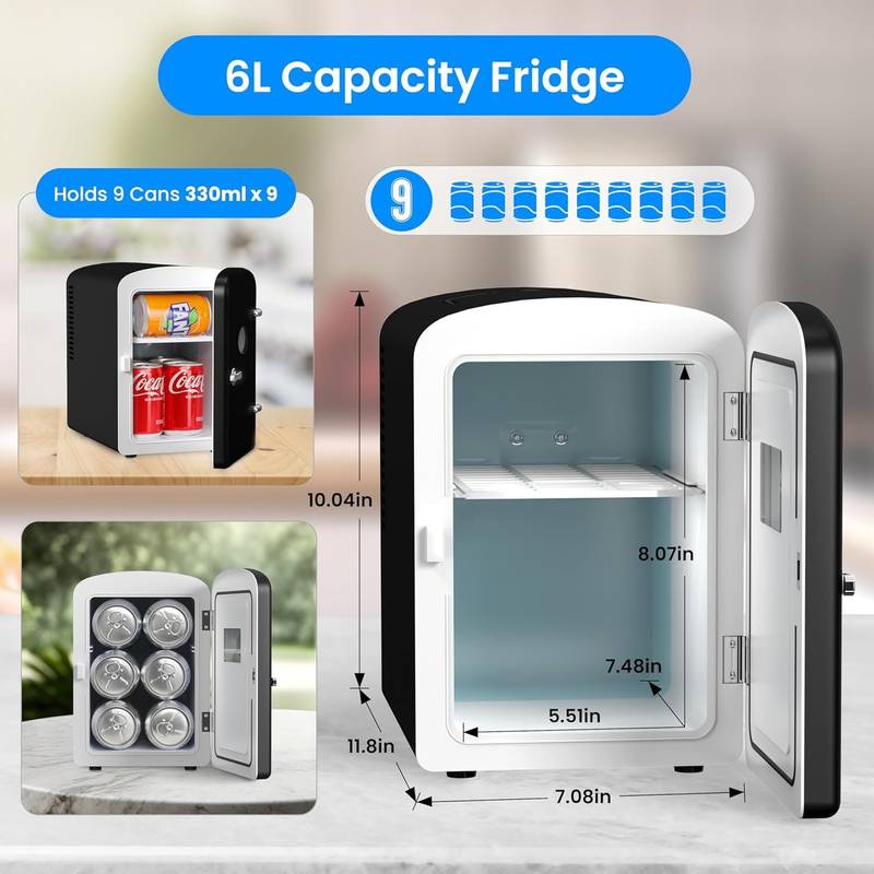- This sleek fridge has a 6-liter capacity, perfect for storing up to 9 cans of your favorite beverages. Its dimensions allow it to fit snugly on your bookshelf or office desk, without taking up too much space.