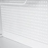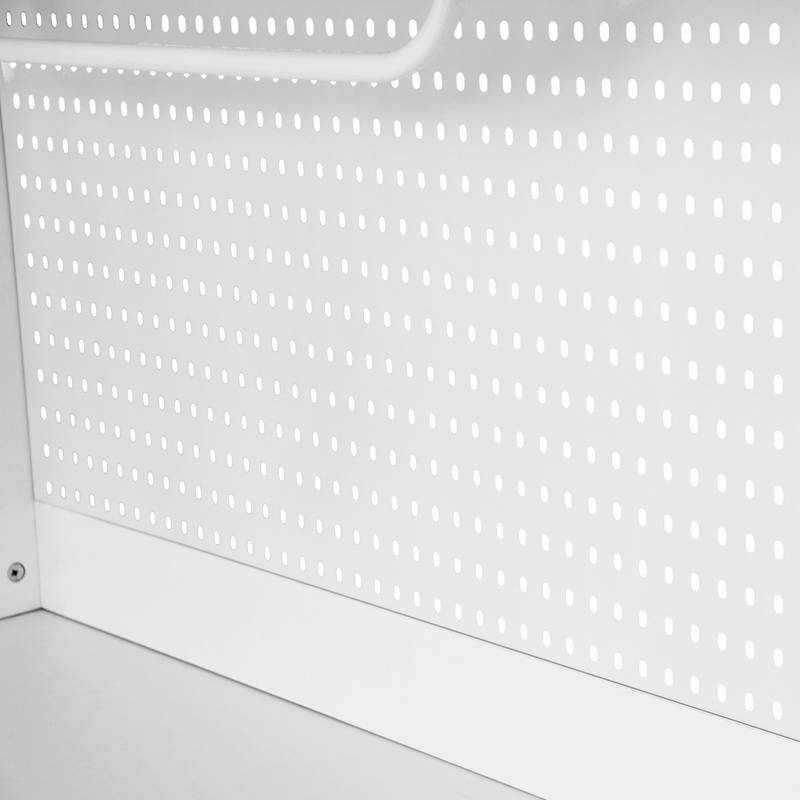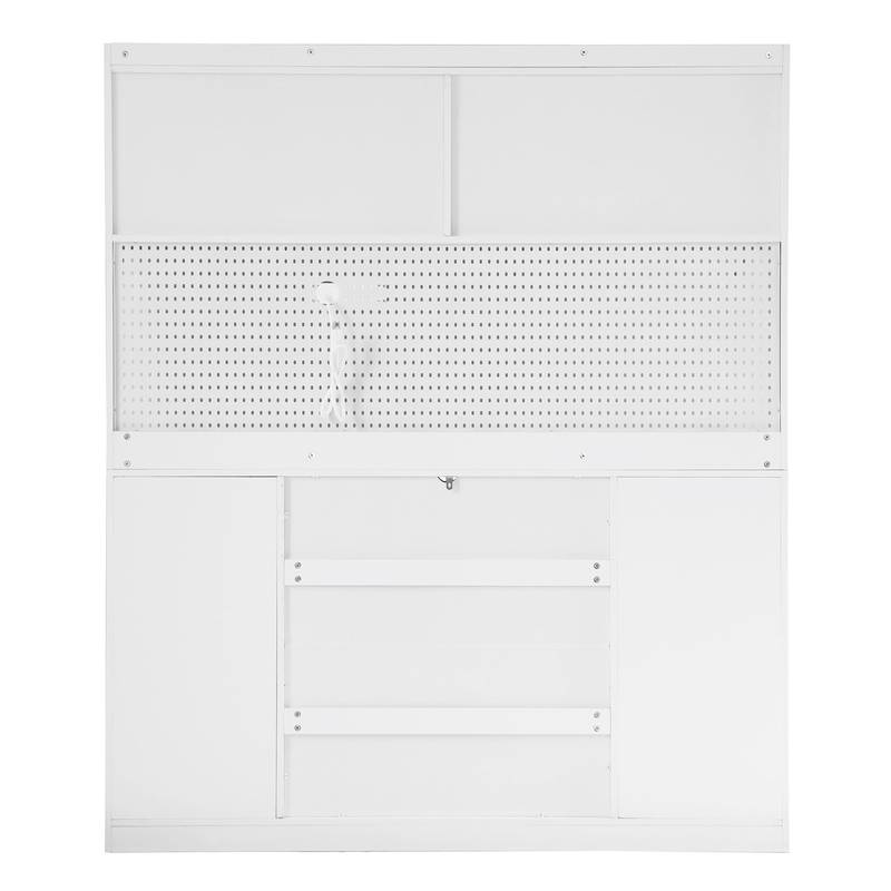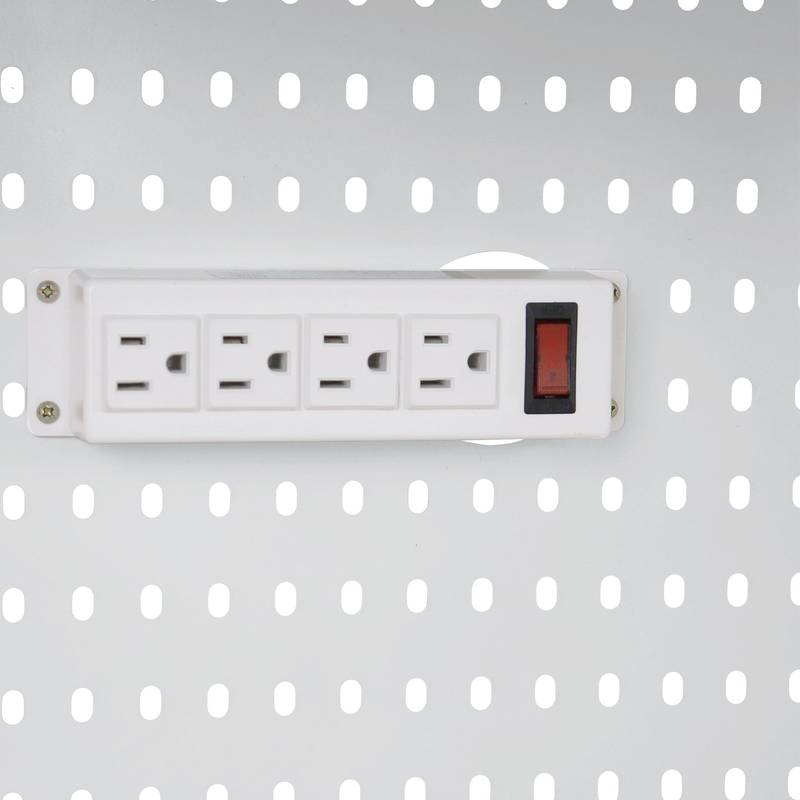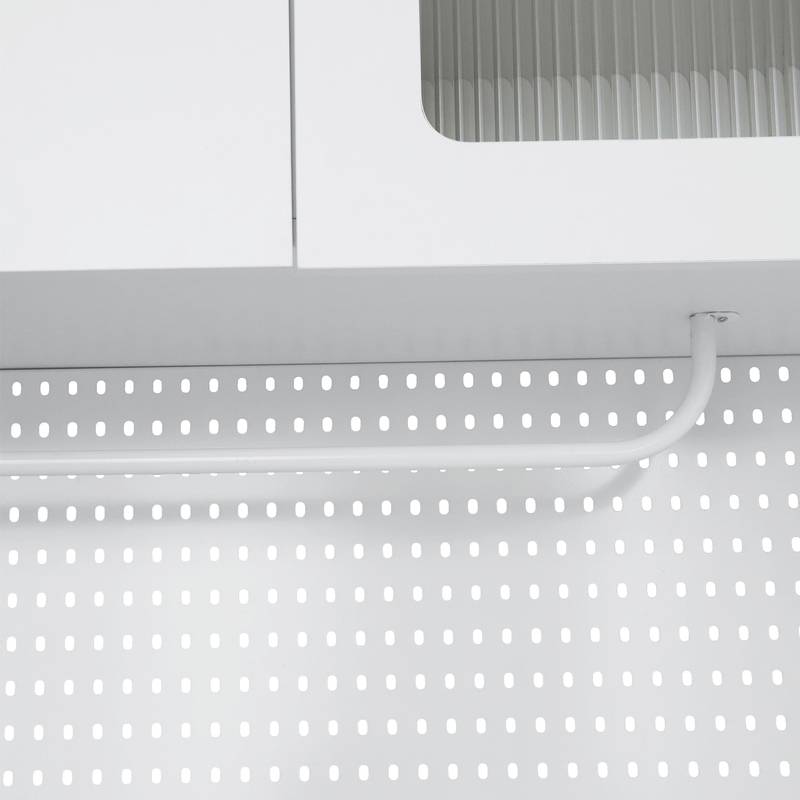- The hutch showcases beautiful glass-front doors and adjustable shelves, making it ideal for displaying your favorite decor. Stay organized with built-in features like a power outlet, towel rack, and pegboard for extra storage.