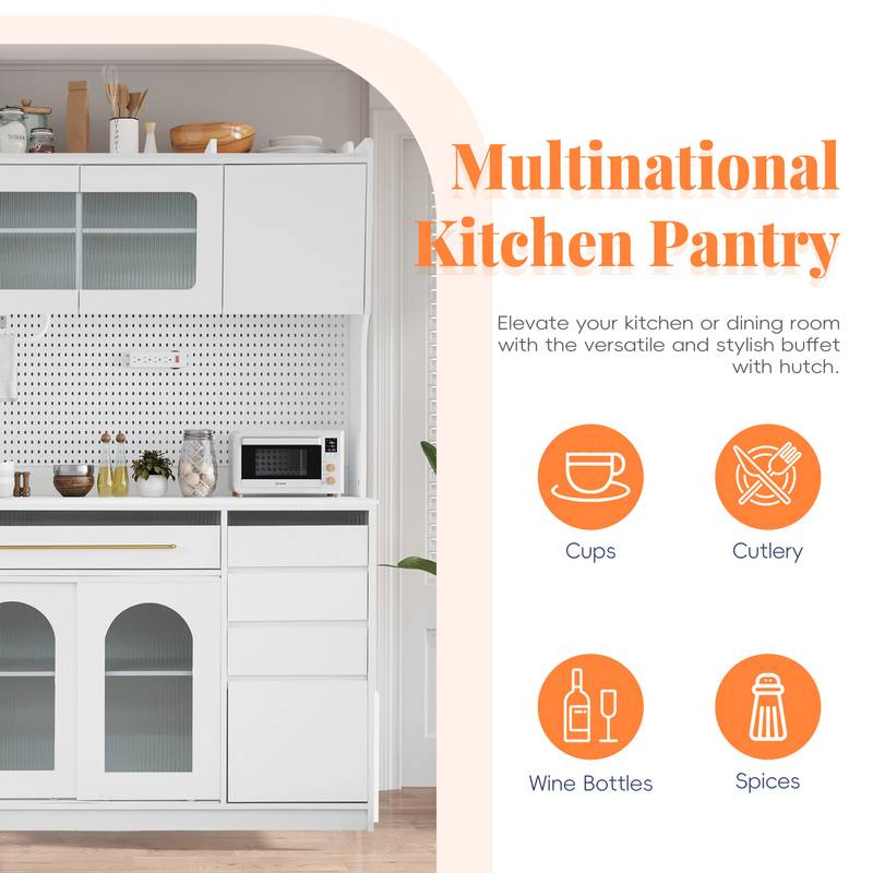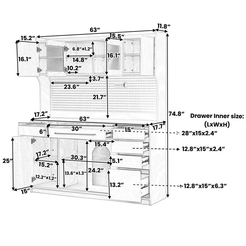 - Dimensions: 63x17.7x74.8 inches (LxWxH), with a weight capacity of 30 lbs per shelf, 55 lbs for the countertop, and 22 lbs per drawer. Elevate your space with this functional and chic buffet!