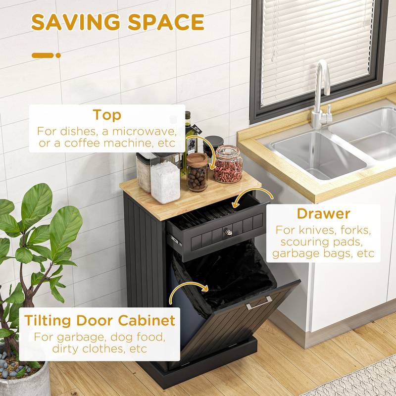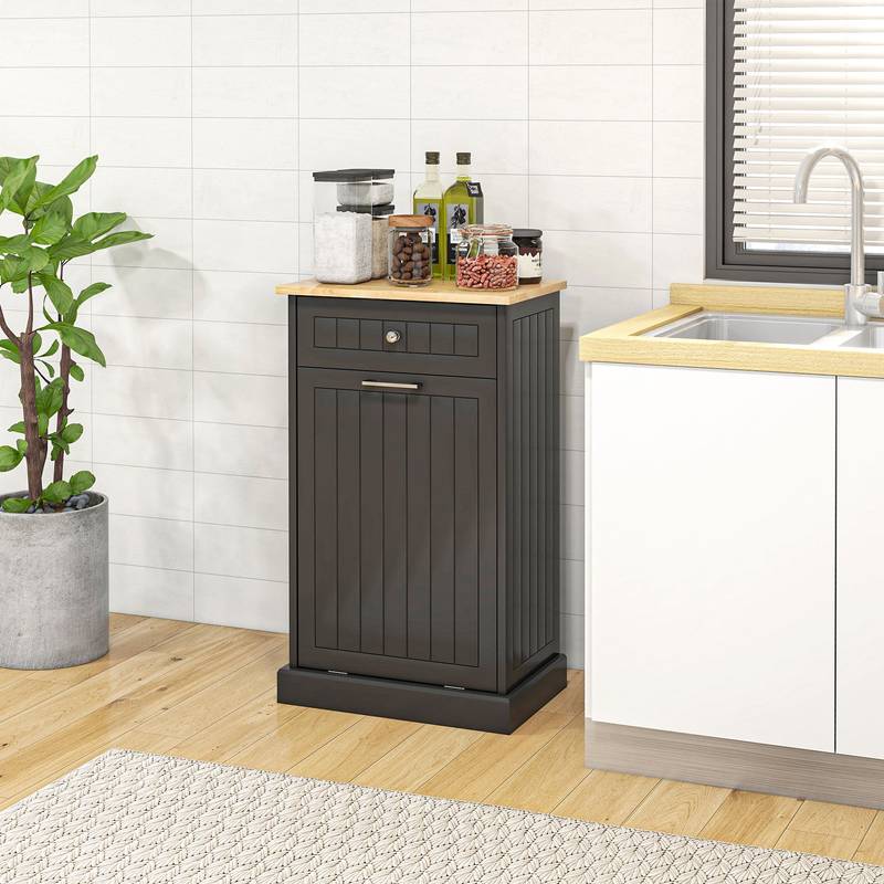 - Elevate your kitchen with our sleek black multifunctional trash cabinet. Designed to keep your space tidy and stylish, this cabinet not only hides away trash and keeps pets at bay, but can also double as a laundry hamper or dog food storage.