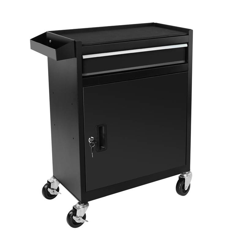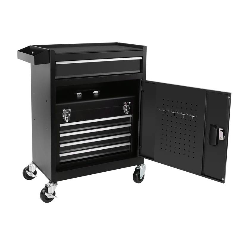 - Introducing our versatile and durable tool cabinet, designed for optimal organization and convenience. Made from heavy-duty steel, this sleek black cabinet stands at 41.10 inches tall and provides ample storage with a spacious top tray, five drawers, a large bottom cabinet, and a side toolbox.