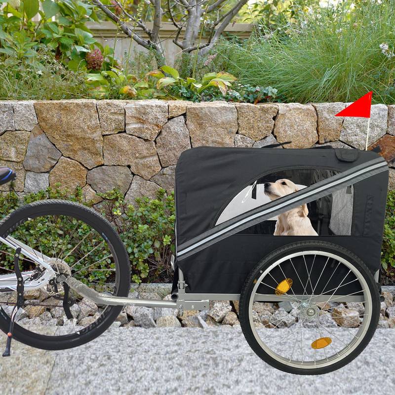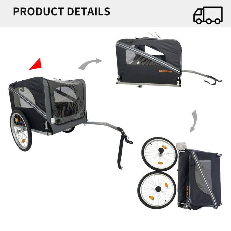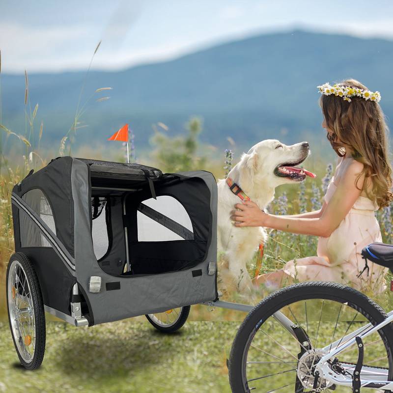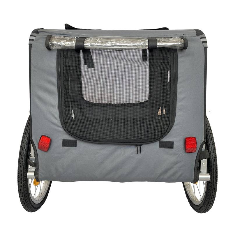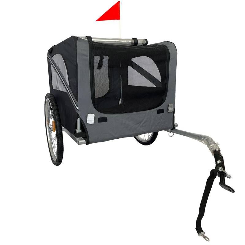 - Meet the perfect solution for your elder or mobility-challenged pets! This stylish black and gray pet trailer is designed for comfort and convenience. Crafted from durable steel with a soft fabric interior, it offers a safe space for your furry friend.