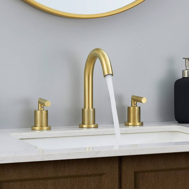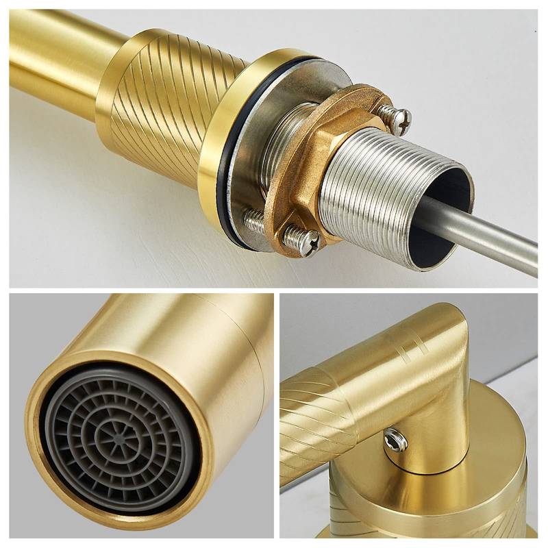 - Elevate your bathroom with our stunning brushed gold bathroom faucet. Crafted from premium 304 stainless steel, this durable, lead-free faucet offers both safety and style. Its sleek brass gold finish resists fingerprints and corrosion, ensuring a chic look that lasts.