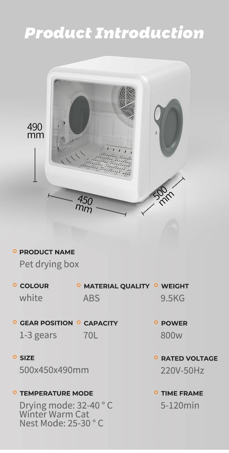 - Introducing the ultimate pet drying solution: our American-style pet dryer designed for both cats and dogs. With a spacious 65L interior, it comfortably accommodates pets of all sizes, from short-haired cats to small dogs.