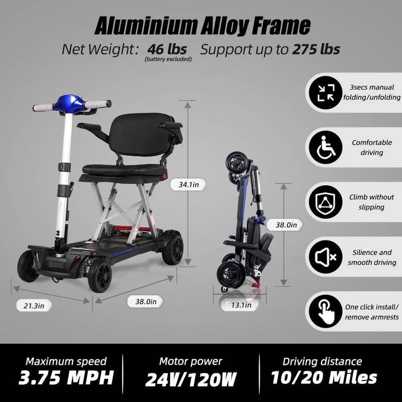 - Introducing the M2085 Blue Mobility Scooter, your perfect travel companion! This innovative scooter features a true foldable design that collapses in just two steps, making storage and transport a breeze. With dimensions of 38.07x21.34x13.19 inches when folded, it fits easily in your car trunk or can be wheeled onto public transport like a suitcase.