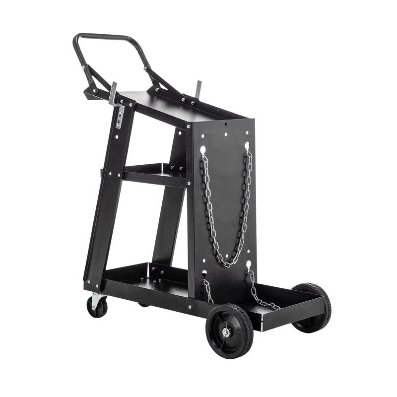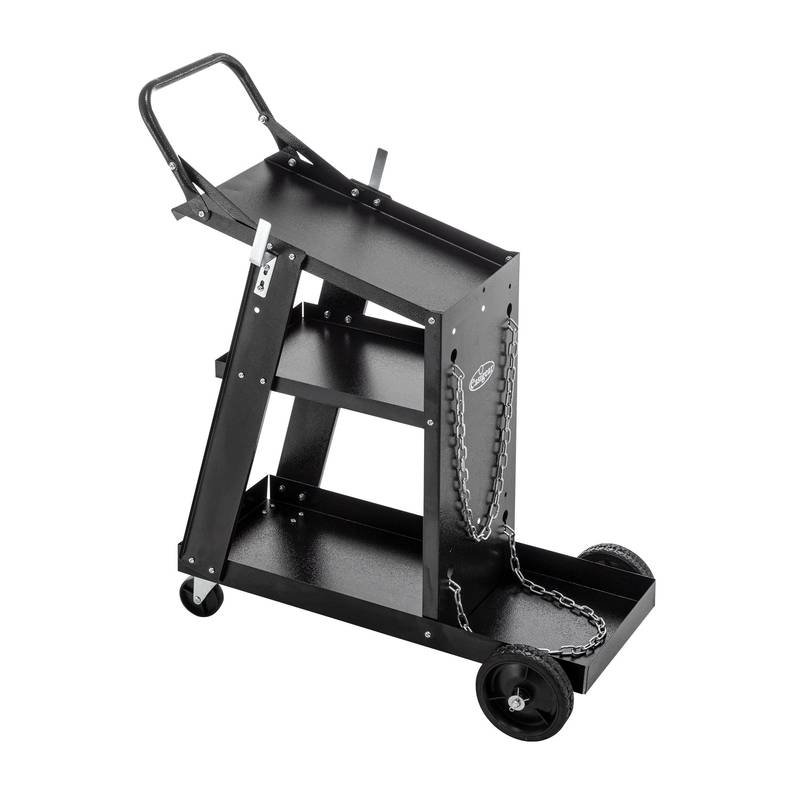 - With three open shelves, it offers ample storage for your welding tools, while the sloping top shelf ensures easy access to controls. The cart features two safety chains for secure gas cylinder placement and includes four durable wheels—two of which swivel 360° for effortless maneuverability.