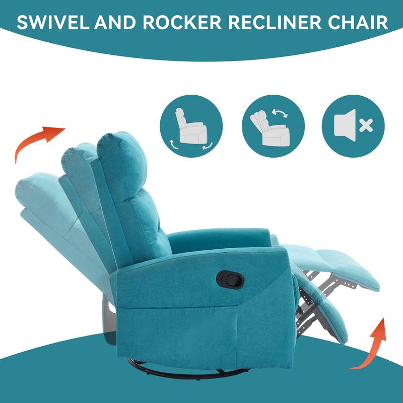 - Introducing our stylish Blue 360° Swivel and Rocking Recliner, crafted with a blend of durable metal and pine wood for a modern American design. Ideal for any living space, this chair features a medium-firm seat plushness and heavy-duty abrasion rating, ensuring comfort and longevity.